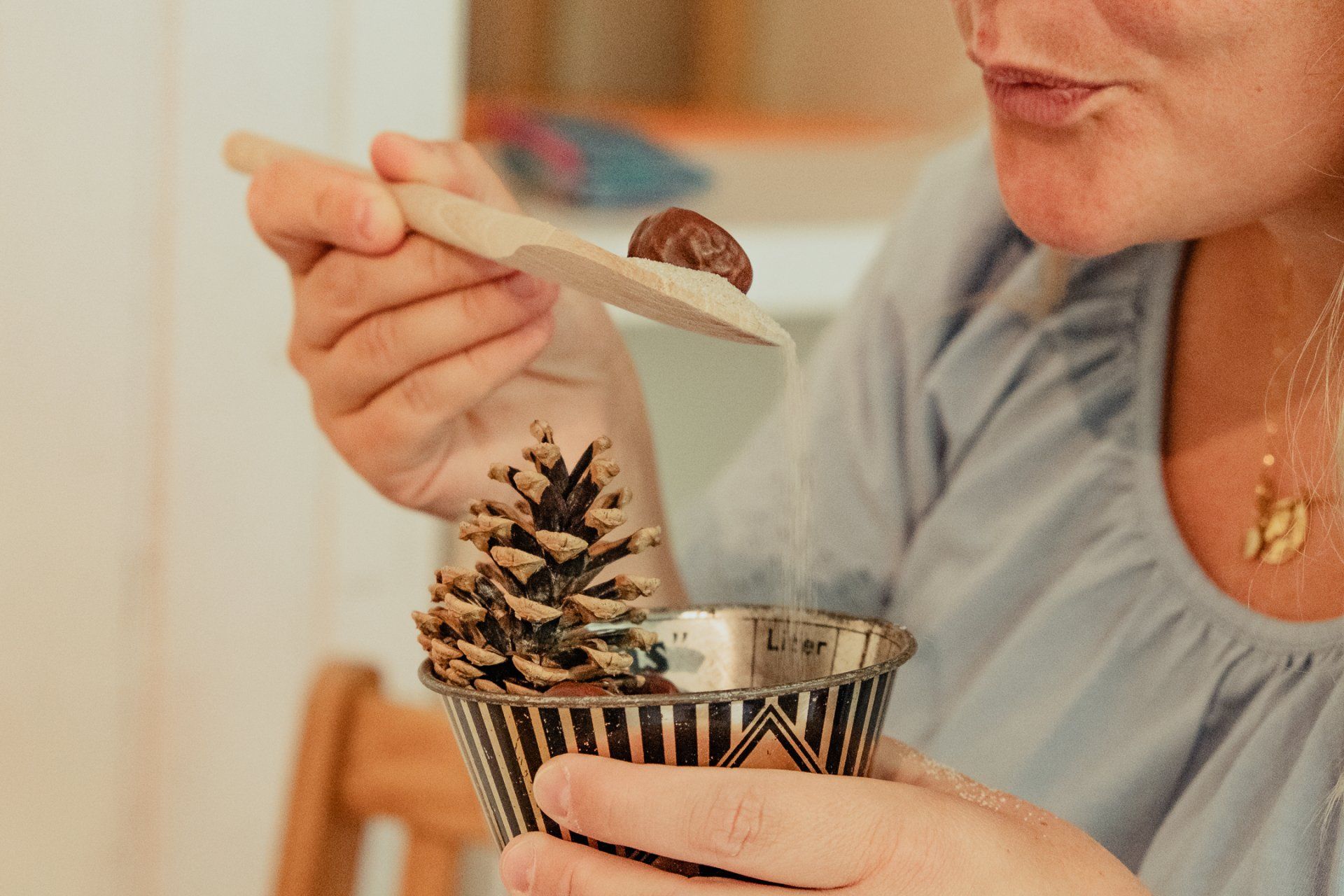 Gleichzeitig waren auch bereits Jugendliche an einem Tisch mit einer großen Emaille-Schüssel und verschiedenen Sieben und Trichtern ganz im Flow und auch ich als erwachsene Mutter genieße meine regelmäßige achtsame SandSpielZeit.